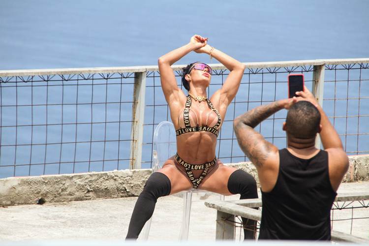 Em um dia ensolarado no Rio, Gracyanne Barbosa parou o Morro do Vidigal nesta quarta-feira (16) durante ensaio fotográfico. A mulher de Belo usou botas pretas, óculos escuros e um biquíni fio-dental bem sensual.
