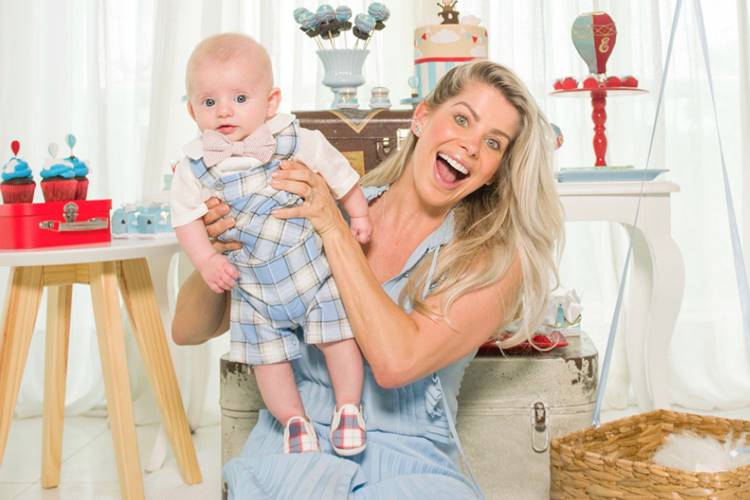 O bebê, fruto de produção independente, ganhou um bolo de aniversário decorado com nuvens e balões, mesa de doces e lembrancinhas personalizadas. Tudo nas cores vermelho, azul e creme.
