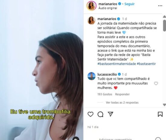 “Eu tive uma trombofilia adquirida e a gente teve que fazer um exame genético. Como é importante falar sobre isso. Imagina se eu tivesse passando por tudo isso sozinha?”, declarou Mariana Rios no vídeo compartilhado em seu Instagram.