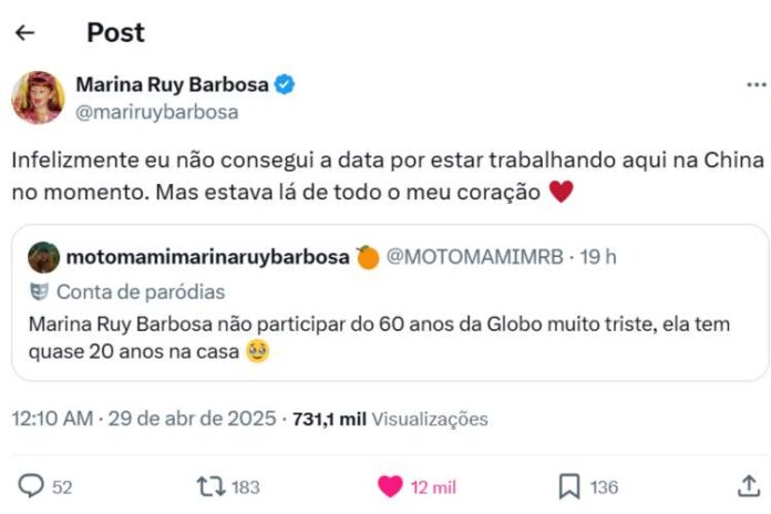 O posicionamento de Marina Ruy Barbosa ocorreu quando ela viu o seguinte comentário, no X, antigo Twitter, notando sua ausência na celebração importante para a emissora e a televisão brasileira também: “Marina Ruy Barbosa não participar do 60 anos da Globo muito triste, ela tem quase 20 anos na casa”, disse um internauta.
