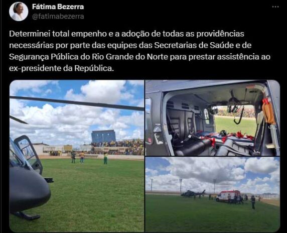 De acordo com informações do portal Metrópoles, a governadora do estado, Fátima Bezerra (PT), cedeu um helicóptero responsável por transferir o ex-presidente para Natal. A aeronave pertence à Secretaria de Segurança Pública do Rio Grande do Norte e levou Bolsonaro para um hospital particular na capital.