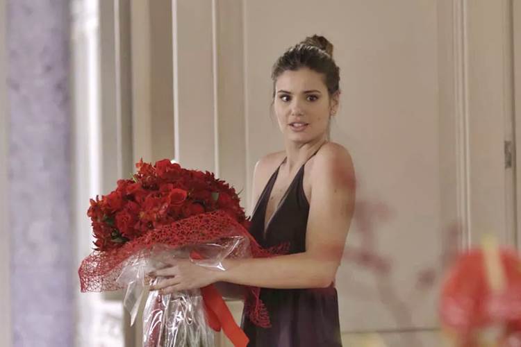 Maria Pia (Mariana Santos) chega bem na hora que os entregadores estão deixando a encomenda e acha que o chefe está lá.