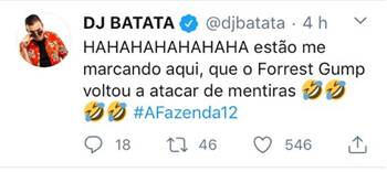 Em um deles, ele chegou a dar um apelido pro funkeiro de um personagem sonhador do cinema. “Hahahahahaha estão me marcando aqui, que o Forrest Gump voltou a atacar de mentiras”, escreveu ele usando a hashtag #afazenda12.
