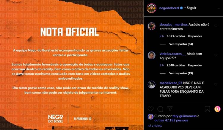 A nota foi publicada no perfil do cantor em rede social. “Somos totalmente favoráveis a apuração de todos e quaisquer fatos que ocorram dentro do reality, bem como a oitiva de todos os envolvidos. Não se deve tomar nenhuma conclusão com base em vídeos cortados e áudios embaralhados. Um tema grave como esse, não poder ser arma de torcida de reality show, bem como não pode ser objeto de julgamento na internet”,m disse a equipe.