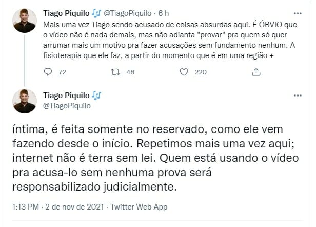 Além disso, a equipe finalizou. “A fisioterapia que ele faz, a partir do momento que é em uma região íntima, é feita somente no reservado, como ele vem fazendo desde o início. Repetimos mais uma vez aqui; internet não é terra sem lei. Quem está usando o vídeo pra acusa-lo sem nenhuma prova responsabilizado responderá judicialmente”, escreveu.