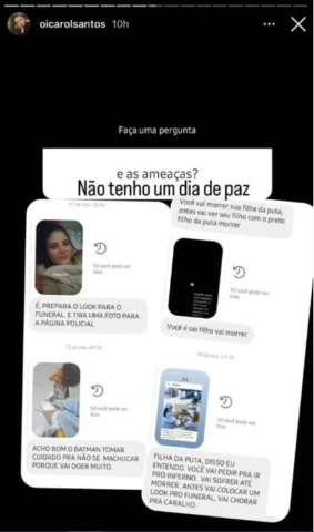 Dentre as frases que ela postou nos stories é possível ler algumas como: ”Você vai morrer, sua filha da put*. Antes, vai ver seu filho com o preto filho da put* morrer. Você e seu filho vão morrer.” Outro escreveu: ”É, prepara o look para o funeral. E tira uma foto para a página policial.” Outro disse: ”Acho bom o Batman tomar cuidado pra não se machucar porque vai doer muito.”