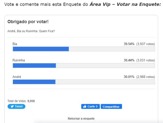 Os números da enquente neste momento são os seguintes: Bia é a favorita para permanecer no jogo, do total de 9,956 votos ela possui 3.937 votos, o que equivale a 39,54%. Já a Ruivinha é a segunda peoa favorita para ficar no reality, ela possui 3,031 votos até este momento, ou 30,44%. Já André é o menos votado para permanecer no jogo, ele possui 2.988 votos, ou 30,01%. Uma disputa acirrada entre Ruivinha e André.