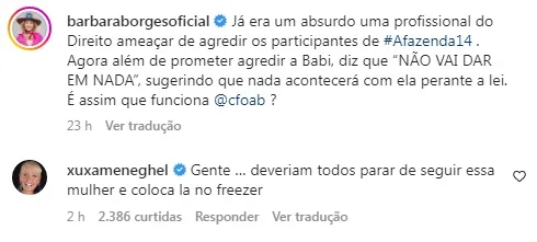 Tudo começou quando a equipe de Bárbara Borges fez um post no perfil do Instagram da peoa. “Já era um absurdo uma profissional do Direito ameaçar de agredir os participantes de #AFazenda14. Agora além de prometer agredir a Babi, diz que ‘NÃO VAI DAR EM NADA’, sugerindo que nada acontecerá com ela perante a lei. É assim que funciona @cfoab?”, escreveu a equipe na publicação.