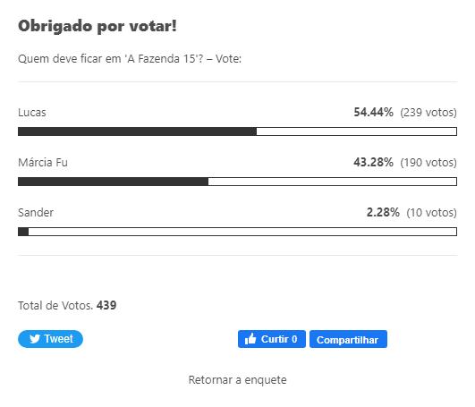 O Área VIP decidiu abrir uma enquete para medir a temperatura de mais uma eliminação do reality show rural da emissora dos Bispos. Até o fechamento desta matéria, 439 pessoas tinham registrado seus votos. No total, 54.44% acham que Lucas deve continuar em A Fazenda, o que equivale a 239 votos. Em segundo lugar aparece Márcia Fu, com 43.28%, ou seja, 190 votos. Sander obteve 2.28%, ou 10 votos.