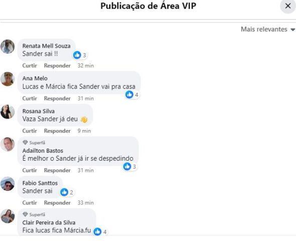 Na página do Facebook desse portal, vários internautas também cravaram a saída de Sander da competição. Os usuários da rede social em questão fizeram as seguintes observações sobre o assunto: ”Sander fofoqueiro fraudou a prova e a produção nem falou nada!!”. ”Tchau Sandero planta”. ”Sander saiiii, fica Lucas e Márcia”. ”Tchau cozinheiro sanders lkkk”. ”Já estou vendo sander voltando pra casa !!”. Vale lembrar que a eliminação acontece na noite de hoje, 16 de novembro, na Record TV, a partir das 22h:45. Fique ligado aqui para receber mais informações sobre A Fazenda 15. Confira abaixo!
