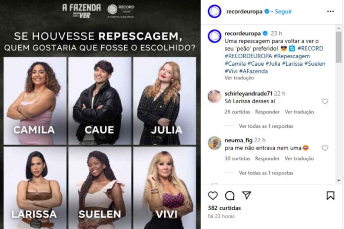 O perfil da Record Europa, acabou agitando o público do reality rural da emissora, A Fazenda 16, no Instagram. Acontece que foi dado um sinal sobre uma possível repescagem na atração, que ao logo dos quase 2 meses que está no ar acabou tendo 3 desfalques no elenco.
