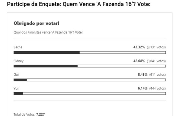 Sacha soma, até o momento, 3,131 mil votos, contra 3,041 de Sidney, em disputa acirrada na enquete que conta com mais de 7,227 mil votos, apontando o favoritismo dos usuários pelos dois peões na final do reality da Record TV.