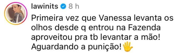 A atriz, ao demonstrar sua posição, destacou que essa seria a primeira vez que Vanessa demonstrou atitude semelhante desde sua entrada no reality. “Primeira vez que Vanessa levanta os olhos desde que entrou na Fazenda. Aproveitou para também levantar a mão! Aguardando a punição!”, escreveu a famosa.