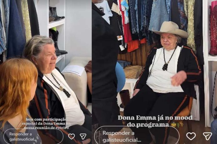 Ela mostrou a presença especial da mãe, Dona Emma, que ainda provou alguns chapéus, mostrando que também tem bastante estilo. “Hoje com participação especial da Dona Emma na nossa reunião de roteiro. Já no ‘mood’ do programa”, comentou Galisteu após a mãe experimentar dois modelos diferentes de chapéu.