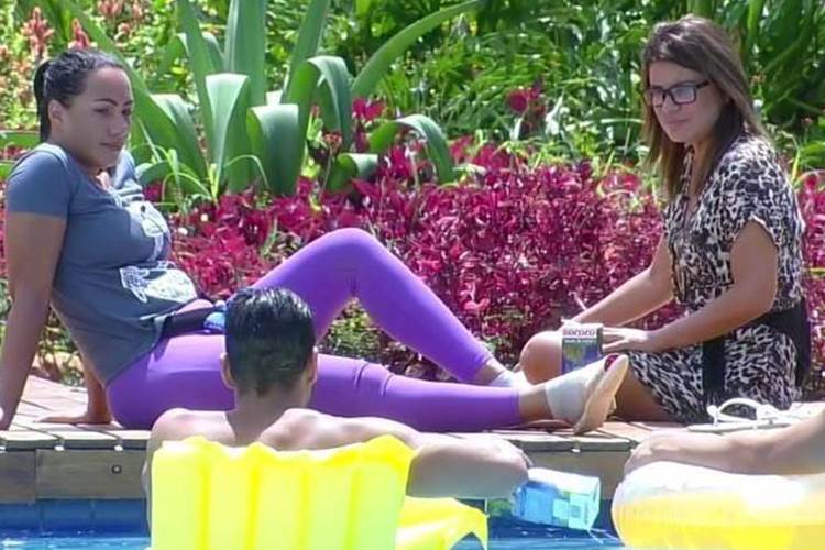 Quelynah, que tinha acabado de preparar arroz, feijão e picadinho de carne com batata, se juntou aos peões na piscina.