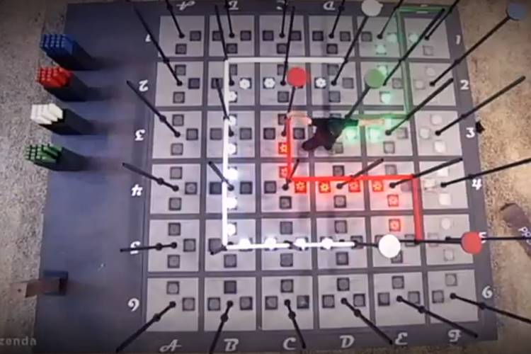 Na disputa, o ajudante tinha que ligar as cores de um tabuleiro com estacas de madeira sem cruzar os caminhos. Cabia ao competidor orientar o peão de cima.