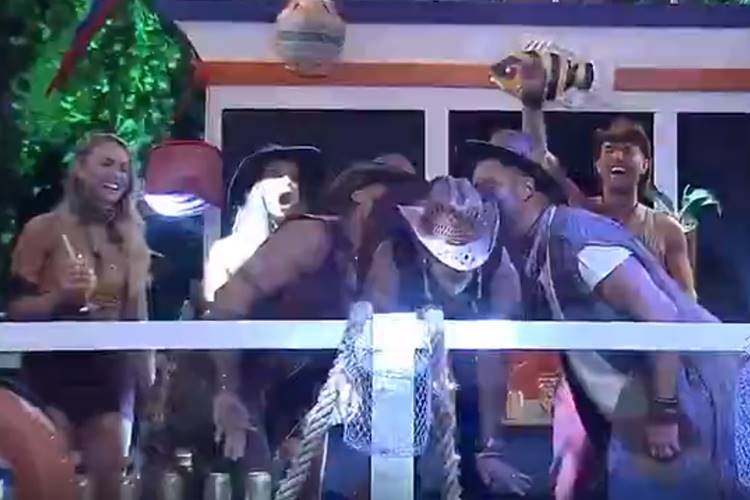 A peoa rebolou, cantou e desceu até o chão, e até recebeu beijinhos no bumbum de todos os confinados, Marcos, Yuri, Matheus, Flavia e Monick.