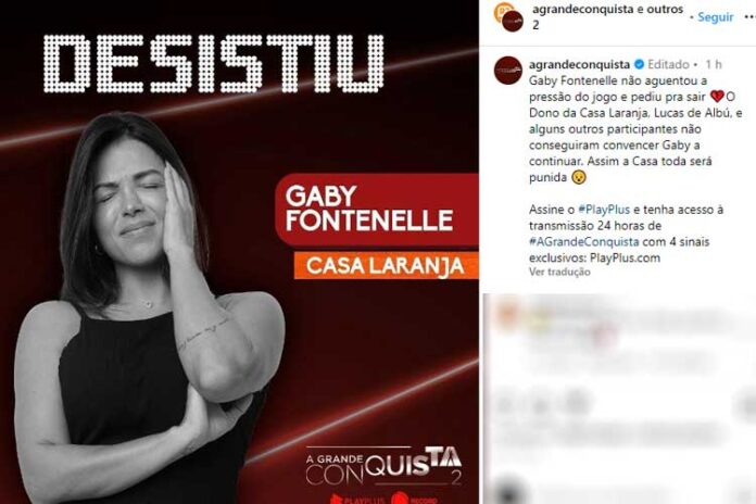 A ex-bailarina do “Hora do Faro”, Gaby Fontenelle, desistiu do reality show “A Grande Conquista 2”, exibido pela TV Record. Ela não suportou a pressão e pediu para deixar a competição iniciada há apenas dois dias.