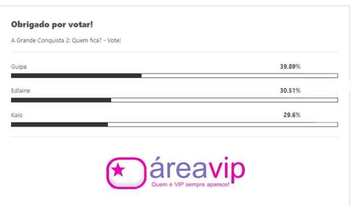 O reality show ‘A Grande Conquista 2‘ segue a todo vapor na telinha da Record e depois da quarta ‘Zona de Risco’ ser definida entre Kaio, Guipa e Edlaine, o Área VIP abriu uma enquete e abaixo publicaremos dados parciais do possível eliminado do programa desta quinta-feira, 06 de junho.