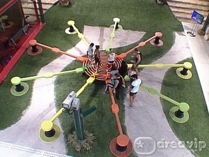 Ele prossegue: “Agora, por favor, todos para o centro da grande estrela. Quando vocês ouvirem o sinal sonoro, caminhem por sua trave até a extremidade e fiquem lá. Só caminhem de volta ao centro, quando o sinal tocar novamente. Só não pode sentar, deitar, ou deixar a estrela cair. É só isso. Quem aguentar mais, ganha a liderança. Divirtam-se!”.