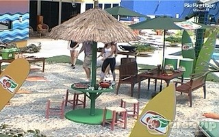 Os brothers encontram um ambiente de praia e churrasco na área externa da casa. No gramado, estão montados quiosques, com pranchas de surfe e coolers com refrigerante.