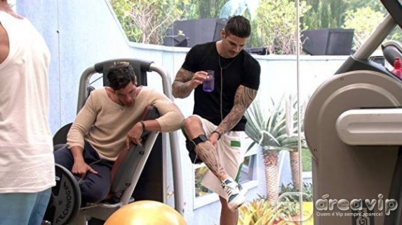 O papo continua rolando enquanto os brothers fazem exercícios. Roni é o único que não está malhando.