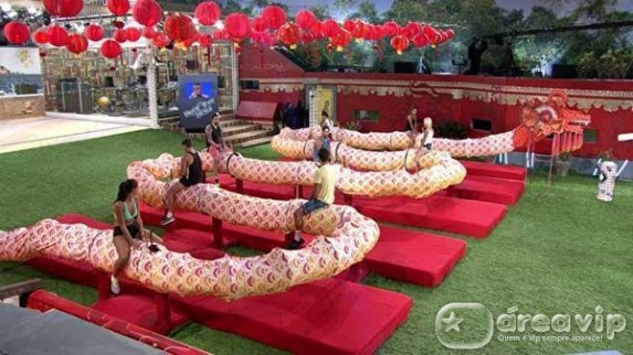 A prova será o seguinte: Quem consegue cavalgar o dragão? Os brothers deverão montar nas costas do monstro e, quando o Bial mandar, precisarão soltar a haste dourada, o que vai liberar a água contida na barriga do bicho. Em seguida, eles vão liberar a haste vermelha, o que vai tornar a montaria instável. E, com o passar do tempo, quanto mais água sair do dragão, mais instável ficará a montaria. O último a se manter sobre o dragão, ganha a liderança”.