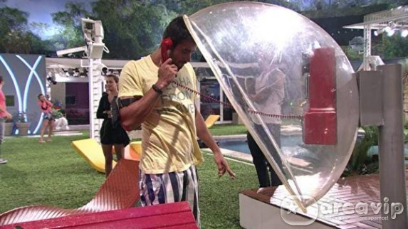 “Ficou faltando um trecho da mensagem do Big Fone. Vai à despensa agora, pegue a pulseira amarela e dê ao participante que você quer dar uma imunidade. Guarde bem esse segredo”. Essa é a parte da mensagem que o brother não escutou quando atendeu ao Big Fone.