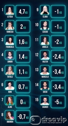 Em oposição, Vagner lidera o ranking dos que perderam mais peso. O paulista já deixou para trás 5 kg. Diego é o segundo que mais emagreceu, ficando 3,4 kg mais leve. Entre as sisters, quem pode comemorar a nova silhueta é Angela. A paulista está 2 kg mais magra.