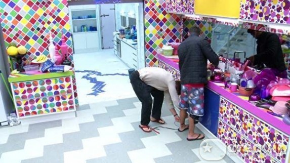 Na cozinha da casa-grande, enquanto Marcelo lava a louça, Roni amarra cordões de tênis nele próprio e no do paranaense.