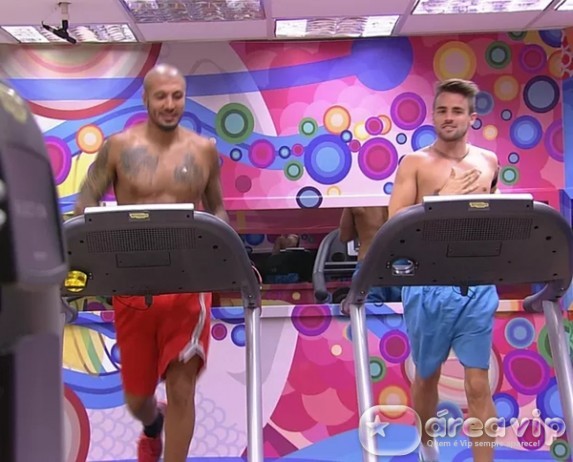 Na academia, Rafael e Fernando correm na esteira. O brother ainda lamenta a saída de Talita, eliminada no Paredão de ontem, com 60% dos votos. “Temos que puxar a orelha um do outro e vim (malhar). Ainda mais com essa rotina e sem a Talita aqui, vou enlouquecer. O negócio é ficar acordado o dia inteiro resenhando, malhar e daí à noite dormir bem”.