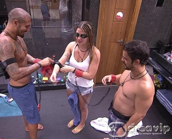“Desculpa, mas tenho que dar pra alguém. Vai o Adrilles, que nunca foi e para vocês dois”, diz a sister para o casal Fernando e Aline. “Vocês já ficam acorrentados”, ameniza a sister.