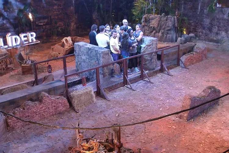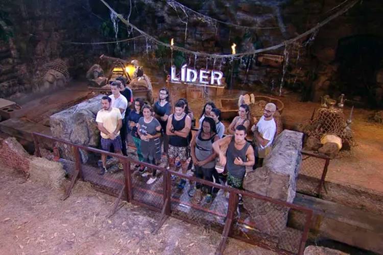 Prova do Líder Espremidos: Os 14 brothers estão em uma estrutura no campo de provas do reality e vão acompanhando o ritmo dela, que se mexe, espremendo-os uns contra os outros.