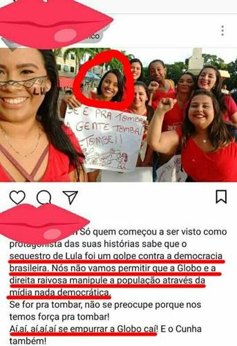 Na foto onde Gleici aparece insultando a emissora, na legenda da imagem diz que a TV Globo foi a responsável pelo “sequestro de Lula” e que a mesma deve cair. Em um cartaz que a jovem segura é possível ver o carro da Globo virado de cabeça para baixo.
