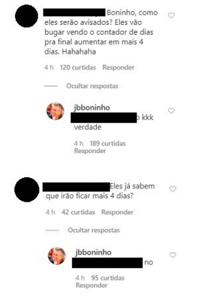 “Como eles serão avisados? Eles vão bugar vendo o contador de dias para final aumentar em mais quatro dias”, pontuou um rapaz. “Kkkkk verdade”, se divertiu o Big Boss.