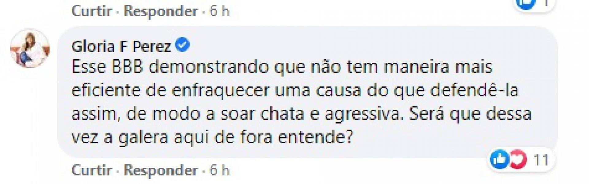 Logo em seguida, sua colega de profissão, Glória Perez foi uma das primeiras internautas a comentar a publicação. “Esse ‘BBB’ vem demonstrando que não tem maneira mais eficiente de enfraquecer uma causa do que defendê-la assim, de modo a soar chata e agressiva. Será que dessa vez a galera aqui de fora entende?“, refletiu a princípio a também autora de novelas.
