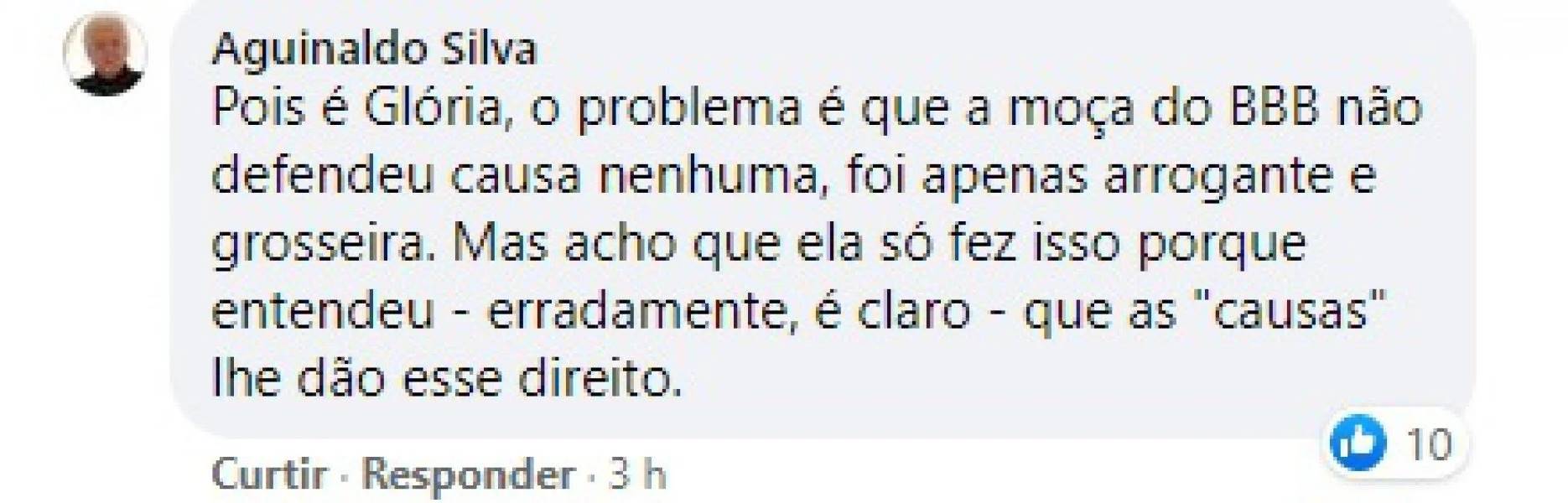 Por fim, em resposta, Aguinaldo acabou chamando a participante Karol Conká de ”arrogante e grosseira” e alertou que a cantora erroneamente se posiciona dentro da casa. “Pois é Glória, o problema é que a moça do ‘BBB’ não defendeu causa nenhuma, foi apenas arrogante e grosseira. Mas acho que ela só fez isso porque entendeu – erradamente, é claro – que as ‘causas’ lhe dão esse direito“, disparou ele na ocasião.