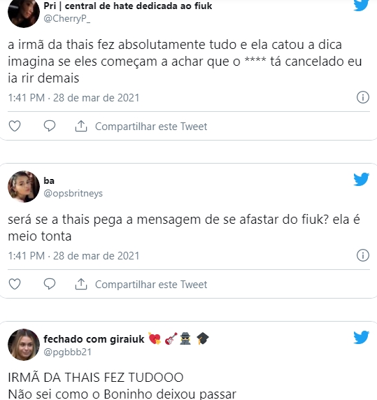 Comentários como: “A irmã da Thais fez absolutamente tudo e ela catou a dica imagina se eles começam a achar que o **** tá cancelado eu ia rir demais”, disse um internauta. “A irmã de Thais fez tudo. Não sei como o Boninho deixou passar, “Que essa franjuda fique longe do Fiuk de uma vez por todas. “Será se a Thais pega a mensagem de se afastar do Fiuk? ela é meio tonta”, escreveu outro internauta do twitter.