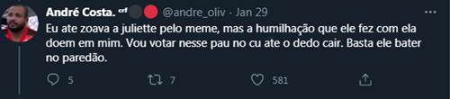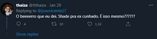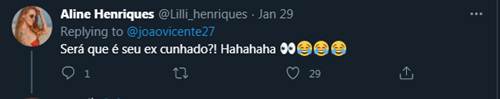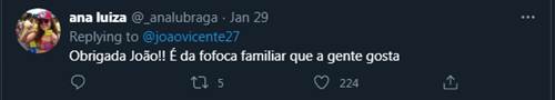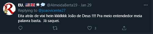 Alguns fãs lembraram que ele é ex-cunhado de Fiuk e concluíram que o cometário era para Fiuk. “ O berro que eu dei. Shade pra ex cunhado. É isso mesmo???”, disse uma. “Obrigada João! É da fofoca familiar que a gente gosta”, divertiu-se outra. “Será que é seu ex cunhado?! hahaha”, questionou outra. “Eita atrás de vixi hein kkk João de Deus!!! Pra meio entendedor meia palavra basta. Já saquei”, disse outro.