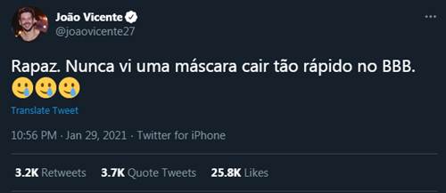 Os internautas estão ligadíssimos no ‘BBB21’. E eles não deixam passar uma boa indireta nas redes sociais. Na noite de sexta-feira (29), João Vicente de Castro fez uma publicação em sua conta no Twitter e despertou a atenção dos fãs.