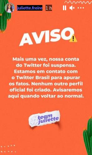 Uma das participantes do ‘BBB21’ com uma equipe que não dorme no ponto, Juliette Freire teve o perfil no Twitter suspenso da plataforma mais uma vez. Quem deu a notícia foram o próprios administradores através de outra rede social, o Instagram, onde a sister já conta com 16 milhões de seguidores.