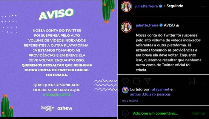 No Instagram, a equipe da sister esclareceu o motivo de o perfil ter saído do ar e contou aos seguidores que todas as medidas para recuperar a conta já estão sendo tomadas. “Nossa conta no Twitter foi suspensa pelo alto volume de vídeos indexados referentes a outra plataforma. Já estamos tomando as providências e em breve ela deve voltar”, iniciou o comunicado.