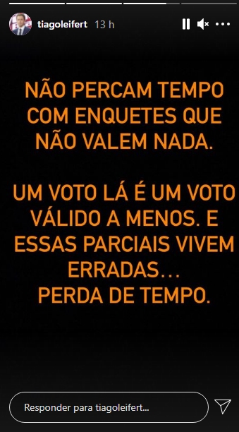 Em seu perfil do Instagram na parte dos Stories o apresentador revelou que a história talvez não seja bem essa; “Não percam tempo com enquetes que não valem nada. Um voto lá é um voto válido a menos. E essas parciais vivem erradas… perda de tempo”, disparou ele.