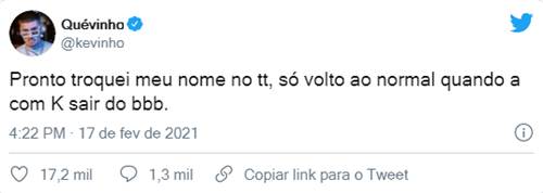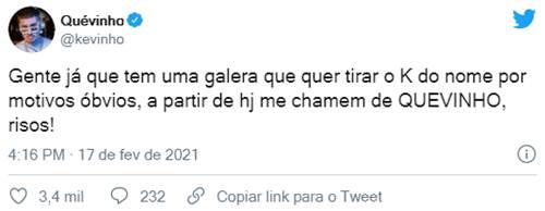 O cantor entrou na brincadeira de tirar o K do nome e fez a alteração na rede social. “Gente já que tem uma galera que quer tirar o K do nome por motivos óbvios, a partir de hoje me chamem de Quévinho, risos!”, publicou no microblog.