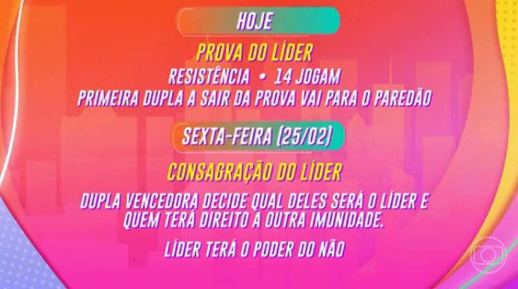 – Consagração do Líder – dupla vencedora decide qual deles será o Líder e quem terá direito a outra imunidade