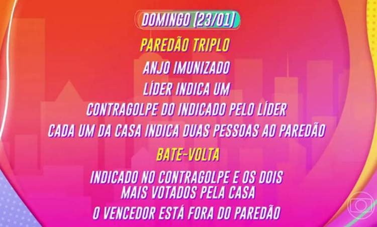 Ele continuou: “No sábado, teremos Prova do Anjo e, no domingo, vamos formar Paredão triplo”, explica o apresentador. Anjo imuniza um, líder indica um, a dupla do líder na prova indica um, o imunizado pelo anjo indica um”.