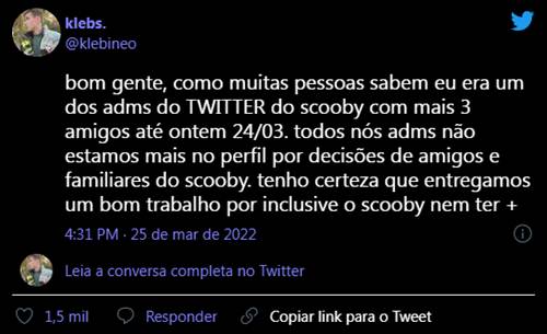 Ele continuou dizendo que tem certeza do bom trabalho que realizou com o resto da equipe: “Tenho certeza que entregamos um bom trabalho por inclusive o Scooby nem ter twitter e a gente ter começado do zero e conquistado quase meio milhão de seguidores e feito uma boa administração certeza”, disse.