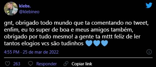 Por fim, o rapaz agradece ainda pelas interações dos fãs do brother durante seu período à frente do perfil: “Agradeço a todo mundo e principalmente as “ondinhas” que sempre estavam com a gente. Hoje o ciclo se encerra para mim e para eles, mas com a certeza entregamos um bom trabalho (como sempre éramos elogiados) e não temos mais vínculos nenhum com o perfil do twitter. Creio que vai ser substituído por alguém”, finalizou.