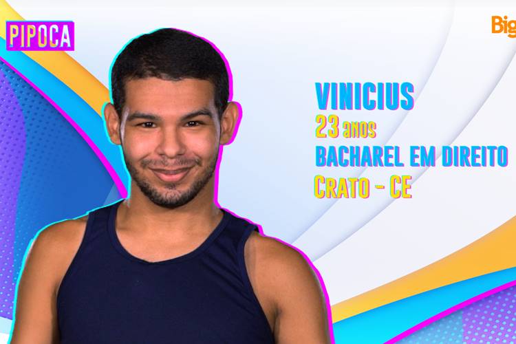 Vinicius tem 23 anos, nasceu em Crato, Ceará e é o novo integrante do Pipoca do BBB22. Mora com o pai, a avó materna e a tia em uma pensão da família. Desde criança é bagunceiro; estava sempre na diretoria da escola por aprontar. Apesar disso, sempre foi muito dedicado e tirava notas altas. Desde muito jovem se virava para ajudar em casa: vendia doces, atuava como professor particular, monitor de colégio público e até cantor de velório. É bacharel em Direito, mas não pretende advogar. Trabalha no restaurante da família e faz vídeos para ganhar uma renda extra nas redes sociais. Conta que usa histórias tristes para fazer humor.
