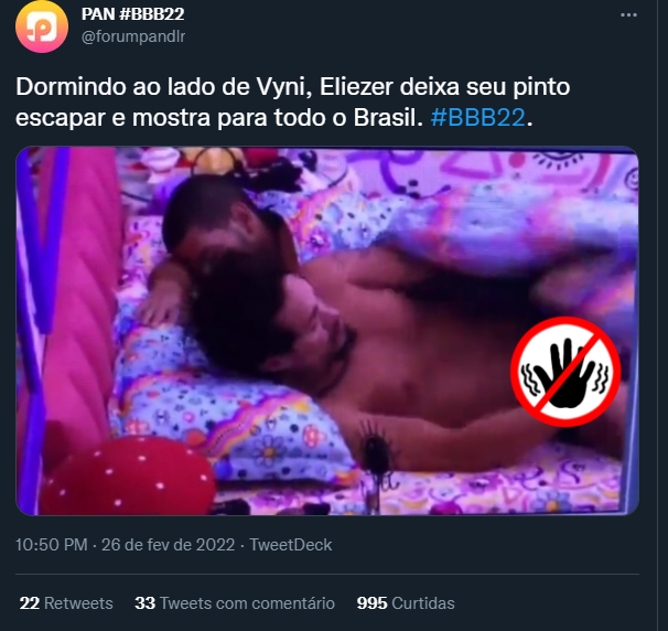 Além disso, vale lembrar que, devido as imagens serem inapropriadas e +18, não iremos divulgar nesta matéria em respeito ao Eliezer e seus familiares. Entretanto ainda vale pontuar que, o BBB22 é transmitido de segunda a segunda, na programação nobre da TV Globo.